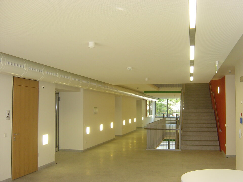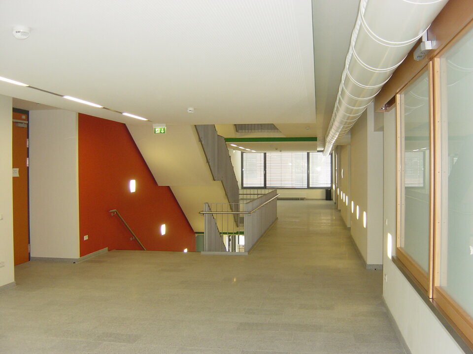 Der Zugang durch den Haupteingang zu den Räumlichkeiten führt durch ein helles Treppenhaus in den ersten Stock.