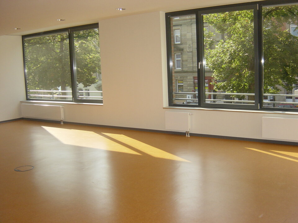 Ein länglich geschnittener Raum, der mit seinem hellen Boden und seiner großen Fensterfront, einen sehr freundlichen Eindruck macht.